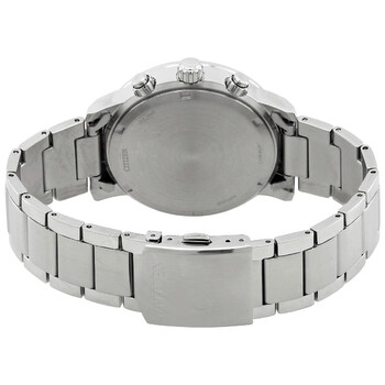 Silver-tone stainless steel case and bracelet. Fixed silver-tone stainless steel bezel. Blue dial with silver-tone hands and index hour markers. Minute markers around the outer rim. Dial Type: Analog. Luminescent hands and markers. Date display at the 3 o'clock position. Chronograph - three sub-dials displaying: 60 second, 60 minute and 24 hour. Citizen Caliber Eco-Drive B612 eco-drive movement. Scratch resistant sapphire crystal. Solid case back. Round case shape, case size: 43 mm, case thickness: 11.5 mm. Deployment with push button release clasp. Water resistant at 100 meters / 330 feet. Functions: chronograph, date, hour, minute, second, solar-powered. Sport watch style. Watch label: Japan Movt. Citizen Chronograph Eco-Drive Blue Dial Men's Watch CA0840-87L.