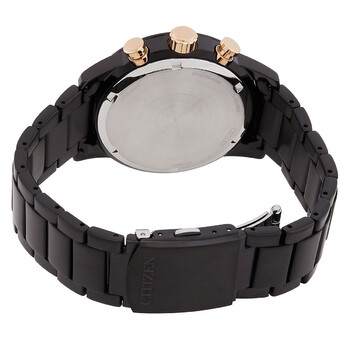 Black IP stainless steel case and bracelet. Fixed black IP stainless steel bezel. Green dial with rose gold-tone hands and index hour markers. Minute markers around the outer rim. Dial Type: Analog. Date display at the 3 o'clock position. Chronograph - three sub-dials displaying: 60 second, 60 minute and 24 hour. Citizen Caliber Eco-Drive B612 eco-drive movement. Scratch resistant mineral crystal. Solid case back. Round case shape, case size: 43 mm, case thickness: 11.4 mm. Deployment with push button release clasp. Water resistant at 100 meters / 330 feet. Functions: chronograph, date, hour, minute, second, solar-powered. Sport watch style. Watch label: Japan Movt. Citizen Chronograph Eco-Drive Green Dial Men's Watch CA0746-85X.