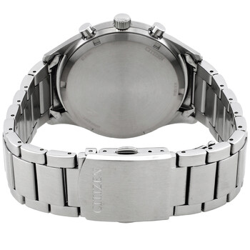 Silver-tone stainless steel case and bracelet. Fixed silver-tone stainless steel bezel. White dial with black hands and index-Arabic numeral hour markers. Minute markers around the outer rim. Dial Type: Analog. Luminescent hands and markers. Date display at the 3 o'clock position. Chronograph - two sub-dials displaying: 60 second and 60 minute. Citizen Caliber B642 eco-drive movement. Scratch resistant mineral crystal. Solid case back. Round case shape, case size: 43 mm. Fold over clasp with a safety release. Water resistant at 100 meters / 330 feet. Functions: chronograph, date, hour, minute, small second, solar-powered. Sport watch style. Watch label: Japan Movt. Citizen Chronograph Eco-Drive White Dial Men's Watch CA7028-81A.