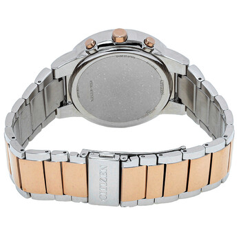 Silver-tone stainless steel case with a two-tone (silver-tone and rose gold-tone) stainless steel bracelet. Fixed silver-tone stainless steel bezel. White dial with rose gold-tone hands and index hour markers. Minute markers around the outer rim. Dial Type: Analog. Date display at the 4 o'clock position. Chronograph - three sub-dials displaying: 60 second, 60 minute and 24 hour. Citizen Caliber Eco-Drive H504 eco-drive movement. Scratch resistant mineral crystal. Pull / push crown. Solid case back. Round case shape, case size: 43 mm. Fold over clasp with a safety release. Water resistant at 30 meters / 100 feet. Functions: chronograph, date, GMT, hour, minute, second, solar-powered. Sport watch style. Watch label: Japan Movt. Citizen Chronograph GMT White Dial Two-Tone Men's Watch AT2244-84A.