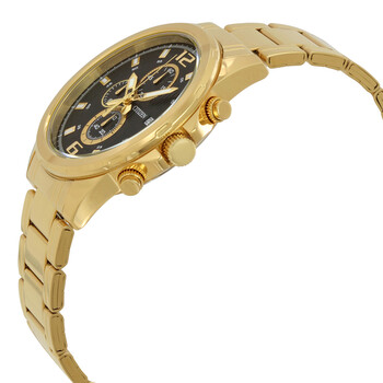 Gold-tone stainless steel case and bracelet. Fixed gold-tone bezel. Black dial with luminous gold-tone hands and index hour markers. Arabic numerals mark the 6 and 12 o'clock positions. Minute markers around the outer rim. Dial Type: Analog. Luminescent hands and markers. Date display at the 3 o'clock position. Chronograph - three sub-dials displaying: 60 second, 60 minute and 12 hours. Quartz movement. Scratch resistant mineral crystal. Solid case back. Case size: 44 mm. Round case shape. Deployment clasp with a push button release. Water resistant at 100 meters / 330 feet. Functions: chronograph, date, hour, minute, second. Sport watch style. Citizen Chronograph Men's Watch AN3552-50E.