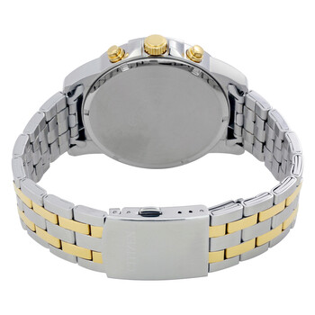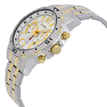 Stainlesss steel case with a two-tone (silver and gold-tone) stainless steel bracelet. Stainlesss steel bezel. White dial with luminous gold-tone hands and index hour markers. Arabic numeral marks the 12 o'clock position. minute markers. tachymeter markings around the outer rim. Dial Type: Analog. Luminescent hands. Date display between the 4 and 5 o'clock positions. Chronograph - three sub-dials displaying: 60 second, 60 minute and 24 hours. Quartz movement. Scratch resistant mineral crystal. Solid case back. Case size: 46 mm. Case thickness: 12 mm. Round case shape. Band width: 20 mm. Fold over with safety release clasp. Water resistant at 50 meters / 165 feet. Functions: chronograph, tachymeter, date, hour, minute, second. Sport watch style. Citizen Chronograph Men's Watch AN8104-53A.