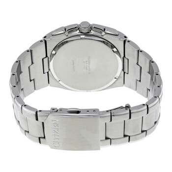 Stainless steel case with a stainless steel bracelet. Fixed stainless steel bezel. Black dial with luminous silver -tone hands and index hour markers. Minute markers around the outer rim. Dial Type: Analog. Luminescent hands. Date display between the 4 and 5 o'clock positions. Day of the week display. Chronograph - two sub-dials displaying: 60 second and 60 minute. Quartz movement. Scratch resistant mineral crystal. Pull / push crown. Solid case back. Case size: 45 mm. Case thickness: 14 mm. Cushion case shape. Band width: 20 mm. Fold over clasp. Water resistant at 100 meters / 330 feet. Functions: chronograph, date, day of the week hour, minute, second. Casual watch style. Citizen Chronograph Men's Watch AN9000-53F.