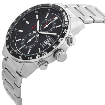 Silver-tone stainless steel case and bracelet. Fixed black stainless steel with an inlaid black ring showing tachymeter markings bezel. Black dial with luminous silver-tone hands and index hour markers. Tachymeter scale around the outer rim. Minute markers around the outer rim. Dial Type: Analog. Luminescent hands and markers. Date display at the 3 o'clock position. Chronograph - three sub-dials displaying: 60 second, 60 minute and 12 hour. Quartz movement. Scratch resistant mineral crystal. Screw down crown. Solid case back. Round case shape, case size: 44 mm. Deployment with push button release clasp. Water resistant at 100 meters / 330 feet. Functions: chronograph, date, hour, minute, second. Sport watch style. Watch label: Japan Movt. Citizen Chronograph Quartz Black Dial Men's Watch AN3600-59E.
