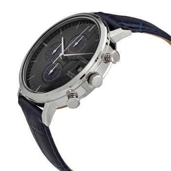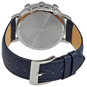 Stainless steel case with a blue (croco-embossed) leather strap. Fixed stainless steel bezel. Black dial with silver-tone hands and index hour markers. Minute markers around the outer rim. Dial Type: Analog. Date display at the 3 o'clock position. Chronograph - three sub-dials displaying: 60 second, 60 minute and 12 hour. Citizen caliber 0510 quartz movement. Scratch resistant mineral crystal. Pull / push crown. Solid case back. Round case shape. Case size: 40 mm. Case thickness: 12 mm. Band width: 21 mm. Tang clasp. Water resistant at 50 meters / 165 feet. Functions: chronograph, date, hour, minute, second. Dress watch style. Watch label: Japan Movt. Citizen Chronograph Quartz Black Dial Men's Watch AN3610-04H.