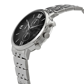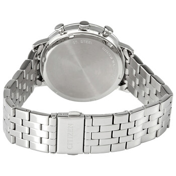 Stainless steel case with a stainless steel bracelet. Fixed stainless steel bezel. Black dial with silver-tone hands and index hour markers. Roman numerals appear at the 3, 6, 9 and 12 o'clock positions. Minute markers around the outer rim. Dial Type: Analog. Date display at the 3 o'clock position. Chronograph - sub-dials displaying: 12 hours, 60 minutes, 60 seconds. Citizen caliber 0510 quartz movement. Scratch resistant mineral crystal. Pull / push crown. Solid case back. Round case shape. Case size: 41 mm. Case thickness: 11.2 mm. Band width: 209 mm. Deployment clasp. Water resistant at 50 meters / 165 feet. Functions: chronograph, date, hour, minute, second. Casual watch style. Citizen Chronograph Quartz Black Dial Men's Watch AN3610-71E.