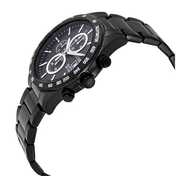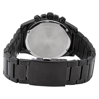 Black stainless steel case with a black stainless steel bracelet. Fixed black stainless steel bezel showing tachymeter markings. Black dial with luminous silver-tone hands and index hour markers. Minute markers around the outer rim. Dial Type: Analog. Luminescent hands and markers. Date display at the 3 o'clock position. Chronograph - three sub-dials displaying: 60 second, 60 minute and 12 hours. Quartz movement. Scratch resistant mineral crystal. Pull / push crown. Solid case back. Round case shape. Case size: 42 mm. Case thickness: 12 mm. Band width: 22 mm. Fold over clasp with a push button release. Water resistant at 100 meters / 330 feet. Functions: chronograph, tachymeter, date, hour, minute, second. Casual watch style. Watch label: Japan Movt. Citizen Chronograph Quartz Black Dial Men's Watch AN3645-51E.