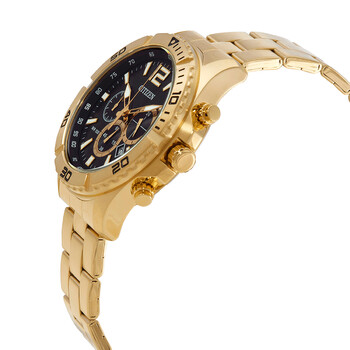 Gold-tone stainless steel case and bracelet. Fixrd gold-tone bezel. Black dial with luminous gold-tone hands and index hour markers. Arabic numeral appears at the 12 o'clock position. Minute markers. Tachymeter markings around the outer rim. Dial Type: Analog. Luminescent hands and markers. Date display between the 4 and 5 o'clock positions. Chronograph - sub-dials displaying: 24 hours, 60 minutes, 60 seconds. Citizen caliber 0520 quartz movement. Scratch resistant mineral crystal. Solid case back. Round case shape. Case size: 44 mm. Case thickness: 12 mm. Band width: 24 mm. Fold over clasp with a push button release. Water resistant at 100 meters / 330 feet. Functions: chronograph, date, hour, minute, second. Casual watch style. Citizen Chronograph Quartz Black Dial Men's Watch AN8122-51E.