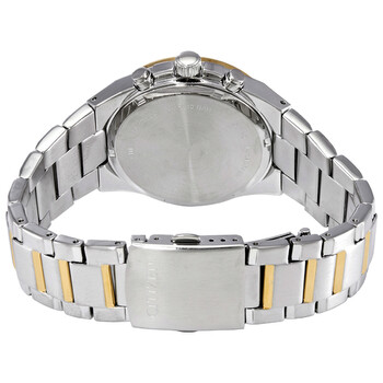 Stainless steel case with a stainless steel bracelet. Fixed gold-tone bezel. Black dial with luminous gold-tone hands and index hour markers. Minute markers. Tachymeter markings around the outer rim. Dial Type: Analog. Luminescent hands and markers. Date display between 4 and 5 o'clock position. Chronograph - three sub-dials displaying: 60 second, 60 minute and 24 hour. Citizen caliber 0520 quartz movement. Scratch resistant mineral crystal. Pull / push crown. Solid case back. Round case shape. Case size: 40 mm. Case thickness: 12 mm. Band width: 20 mm. Fold over clasp with a push button release. Water resistant at 100 meters / 330 feet. Functions: chronograph, date, hour, minute, second. Sport watch style. Watch label: Japan Movt. Citizen Chronograph Quartz Black Dial Men's Watch AN8174-58E.