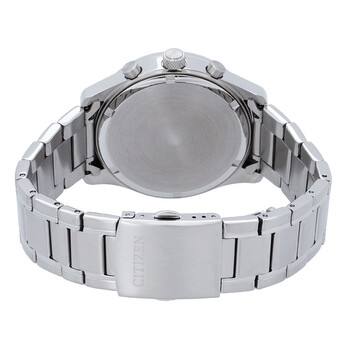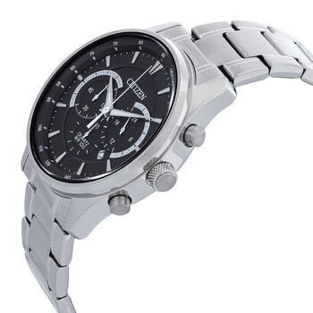 Silver-tone stainless steel case and bracelet. Fixed silver-tone stainless steel bezel. Black dial with silver-tone hands and index hour markers. Minute markers around the outer rim. Dial Type: Analog. Luminescent hands and markers. Date display between 4 and 5 o'clock position. Chronograph - three sub-dials displaying: 60 second, 60 minute and 24 hour. Citizen Caliber 0520 quartz movement. Scratch resistant mineral crystal. Solid case back. Round case shape, case size: 42 mm. Deployment with push button release clasp. Water resistant at 100 meters / 330 feet. Functions: chronograph, date, hour, minute, second. Chronograph Series. Sport watch style. Watch label: Japan Movt. Citizen Chronograph Quartz Black Dial Men's Watch AN8191-59E.
