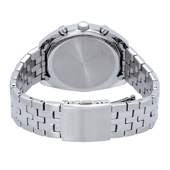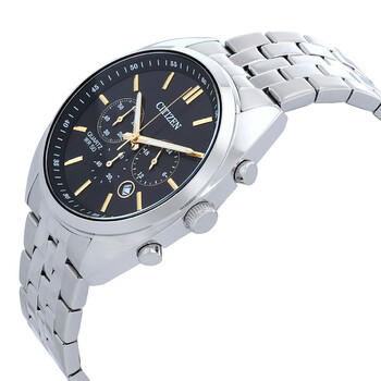 Silver-tone stainless steel case and bracelet. Fixed silver-tone stainless steel bezel. Black dial with luminous gold-tone hands and index hour markers. Minute markers around the outer rim. Dial Type: Analog. Luminescent hands. Date display between 4 and 5 o'clock position. Chronograph - three sub-dials displaying: 60 second, 60 minute and 24 hour. Quartz movement. Scratch resistant mineral crystal. Solid case back. Round case shape, case size: 42 mm, case thickness: 11 mm. Band width: 22 mm. Fold over clasp with a safety release. Water resistant at 50 meters / 165 feet. Functions: chronograph, date, hour, minute, second. Sport watch style. Watch label: Japan Movt. Citizen Chronograph Quartz Black Dial Men's Watch AN8210-56E.