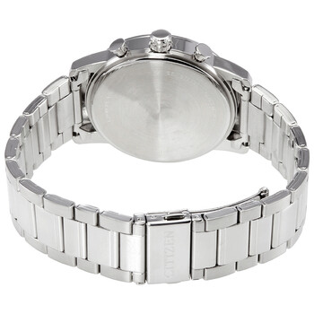 Stainless steel case with a stainless steel bracelet. Fixed stainless steel bezel. Blue dial with luminous silver-tone hands and alternating index and Arabic numeral hour markers. Minute markers around the outer rim. Dial Type: Analog. Luminescent hands and markers. Date display between the 4 and 5 o'clock positions. Chronograph - three sub-dials displaying: 60 second, 60 minute and 12 hour. Citizen caliber 0520 quartz movement. Scratch resistant mineral crystal. Solid case back. Round case shape. Case size: 42 mm. Case thickness: 10.55 mm. Band width: 22 mm. Fold over clasp with a push button release. Water resistant at 50 meters / 165 feet. Functions: chronograph, date, hour, minute, second. Dress watch style. Watch label: Japan Movt. Citizen Chronograph Quartz Blue Dial Men's Watch AN8050-51M.