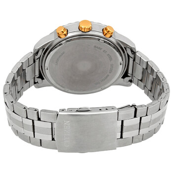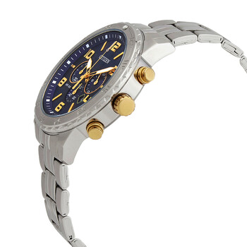 Stainless steel case with a stainless steel bracelet. Fixed stainless steel bezel. Blue dial with luminous gold-tone hands and alternating Arabic numeral and index hour markers. Minute markers around the outer rim. Dial Type: Analog. Luminescent hands and markers. Date display between the 4 and 5 o'clock positions. Chronograph - three sub-dials displaying: 60 second, 60 minute and 24 hour. Quartz movement. Scratch resistant mineral crystal. Solid case back. Round case shape. Case size: 46 mm. Fold over clasp with a push button release. Water resistant at 100 meters / 330 feet. Functions: chronograph, date, hour, minute, second. Casual watch style. Citizen Chronograph Quartz Blue Dial Men's Watch AN8134-52L.