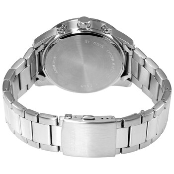 Stainless steel case with a stainless steel bracelet. Fixed stainless steel bezel with an inlaid blue ring showing tachymeter markings. Blue dial with luminous silver-tone hands and alternating Arabic numeral and index hour markers. Minute markers around the outer rim. Dial Type: Analog. Luminescent hands and markers. Date display between the 4 and 5 o'clock positions. Chronograph - sub-dials displaying: 24 hours, 60 minutes, 60 seconds. Citizen Caliber 0520 quartz movement. Scratch resistant mineral crystal. Pull / push crown. Solid case back. Round case shape. Case size: 44 mm. Case thickness: 12 mm. Band width: 22 mm. Fold over clasp with a push buttyon release. Water resistant at 50 meters / 165 feet. Functions: chronograph, tachymeter, date, hour, minute, second. Casual watch style. Citizen Chronograph Quartz Blue Dial Men's Watch AN8161-50L.