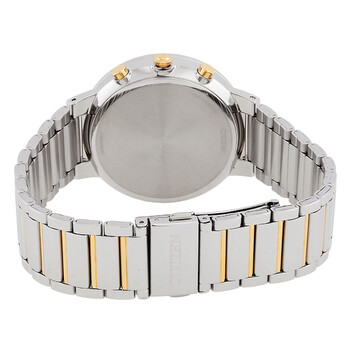 Two-tone (silver-tone and gold-tone) stainless steel with gold plating case with a two-tone (silver-tone and gold-tone) stainless steel bracelet. Fixed silver-tone stainless steel bezel. Blue dial with gold-tone hands and index hour markers. Minute scale around the inner rim. Dial Type: Analog. Date display between 4 and 5 o'clock position. Chronograph - three sub-dials displaying: 60 second, 60 minute and 1/10th of a second. Citizen Caliber 0520-C0A quartz movement. Scratch resistant mineral crystal. Solid case back. Round case shape, case size: 42 mm. Fold over clasp with a safety release. Water resistant at 50 meters / 165 feet. Functions: chronograph, date, hour, minute, second. Sport watch style. Watch label: Japan Movt. Citizen Chronograph Quartz Blue Dial Men's Watch AN8224-51L.