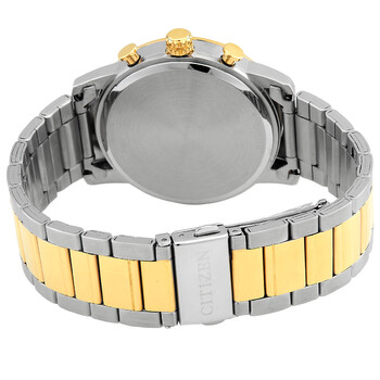 Silver-tone stainless steel case with a two-tone (silver-tone and gold-tone) stainless steel bracelet. Fixed gold-tone stainless steel bezel. Blue dial with gold-tone hands and index-Arabic numeral hour markers. Minute markers around the outer rim. Dial Type: Analog. Luminescent hands and markers. Date display between 4 and 5 o'clock position. Chronograph - three sub-dials displaying: 60 second, 60 minute and 24 hour. Citizen Caliber 0520 quartz movement. Scratch resistant mineral crystal. Pull / push crown. Solid case back. Round case shape, case size: 42 mm. Fold over clasp with a safety release. Water resistant at 50 meters / 165 feet. Functions: chronograph, date, hour, minute, second. Sport watch style. Watch label: Japan Movt. Citizen Chronograph Quartz Blue Dial Two-Tone Men's Watch AN8059-56L.