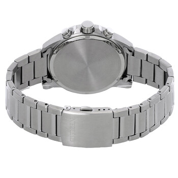 Silver-tone stainless steel case and bracelet. Fixed silver-tone stainless steel bezel. Blue dial with luminous silver-tone hands and index-Arabic numeral marking the 12 o'clock position hour markers. Minute markers around the outer rim. Dial Type: Analog. Luminescent hands and markers. Date display at the 3 o'clock position. Quartz movement. Scratch resistant mineral crystal. Pull / push crown. Solid case back. Round case shape, case size: 43 mm. Fold over clasp with a safety release. Water resistant at 100 meters / 330 feet. Functions: chronograph, date, hour, minute, second. Casual watch style. Watch label: Japan Movt. Citizen Chronograph Quartz Blue Dial Watch AN3690-56L.