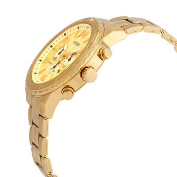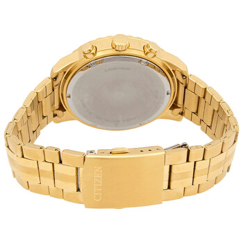 Gold-tone stainless steel case and bracelet. Fixed gold-tone bezel. Gold dial with luminous gold-tone hands and alternating Arabic numeral and index hour markers. Minute markers around the outer rim. Dial Type: Analog. Luminescent hands. Date display between the 4 and 5 o'clock positions. Chronograph - sub-dials displaying: 24 hours, 60 minutes, 60 seconds. Quartz movement. Scratch resistant mineral crystal. Pull / push crown. Solid case back. Round case shape. Case size: 46 mm. Case thickness: 12 mm. Band width: 21 mm. Fold over clasp with a push button release. Water resistant at 100 meters / 330 feet. Functions: chronograph, date, hour, minute, second. Casual watch style. Citizen Chronograph Quartz Gold Dial Men's Watch AN8132-58P.