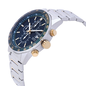 Silver-tone stainless steel with gold platingl case with a two-tone (silver-tone and gold-tone) stainless steel bracelet. Fixed silver-tone stainless steel with an inlaid green ring bezel. Green dial with luminous gold-tone hands and index hour markers. Tachymeter scale around the outer rim. Dial Type: Analog. Luminescent hands and markers. Date display at the 3 o'clock position. Chronograph - three sub-dials displaying: 60 second, 60 minute and 12 hour. Citizen Caliber 0510-C0A quartz movement. Scratch resistant mineral crystal. Solid case back. Round case shape, case size: 44 mm. Fold over clasp with a safety release. Water resistant at 100 meters / 330 feet. Functions: chronograph, date, hour, minute, second. Casual watch style. Watch label: Japan Movt. Citizen Chronograph Quartz Green Dial Men's Watch AN3689-55X.