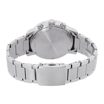 Silver-tone stainless steel case and bracelet. Fixed silver-tone stainless steel bezel. Green dial with silver-tone hands and index hour markers. Minute scale around the inner rim. Dial Type: Analog. Luminescent hands and markers. Date display at the 3 o'clock position. Chronograph - three sub-dials displaying: 60 second, 60 minute and 24 hour. Citizen Caliber B612 quartz movement. Scratch resistant sapphire crystal. Solid case back. Round case shape, case size: 43 mm, case thickness: 11.5 mm. Fold over clasp with a safety release. Water resistant at 100 meters / 330 feet. Functions: chronograph, date, hour, minute, second. Sport watch style. Watch label: Japan Movt. Citizen Chronograph Quartz Green Dial Men's Watch CA0840-87X.