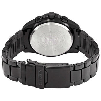 Black-plated stainless steel case and bracelet. Fixed black-plated bezel. Green dial with luminous silver-tone hands and index hour markers. Arabic numeral appears at the 3, 6, 9 and 12 o'clock positions. Minute markers around the outer rim. Dial Type: Analog. Luminescent hands and markers. Date display at the 4 o'clock position. Linea day of the week. Chronograph - three sub-dials displaying: 60 second, 60 minute and 1/10th of a second. Caliber E660 quartz movement. Scratch resistant sapphire crystal. Solid case back. Round case shape. Case size: 42.3 mm. Case thickness: 13.9 mm. Band width: 21 mm. Fold over clasp with a push button release. Water resistant at 200 meters / 660 feet. Functions: chronograph, hour, minute, second. Additional Info: alarm, chronograph, perpetual calendar, power reserve indicator. Casual watch style. Watch label: Japan Movt. Citizen Chronograph Quartz Green Dial Men's Watch CB5925-82X.