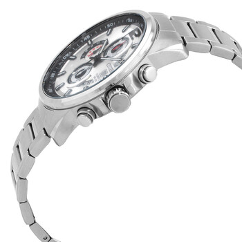 Silver-tone stainless steel case and bracelet. Fixed silver-tone stainless steel bezel. Silver dial with silver-tone hands and index hour markers. Arabic numeral marker appears at the 12 o'clock postion. Arabic numeral minute markers (at 5 minute intervals). Dial Type: Analog. Date display at the 3 o'clock position. Chronograph - three sub-dials displaying: 60 second, 60 minute and 24 hour. Quartz movement. Scratch resistant mineral crystal. Solid case back. Round case shape, case size: 44 mm, case thickness: 11.6 mm. Fold over clasp with a safety release. Water resistant at 100 meters / 330 feet. Functions: chronograph, date, hour, minute, second. Sport watch style. Watch label: Japan Movt. Citizen Chronograph Quartz Silver Dial Men's Watch AN3690-56A.