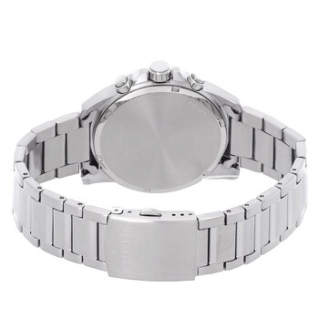 Silver-tone stainless steel case and bracelet. Fixed silver-tone stainless steel bezel. Silver dial with silver-tone hands and index hour markers. Arabic numeral marker appears at the 12 o'clock postion. Arabic numeral minute markers (at 5 minute intervals). Dial Type: Analog. Date display at the 3 o'clock position. Chronograph - three sub-dials displaying: 60 second, 60 minute and 24 hour. Quartz movement. Scratch resistant mineral crystal. Solid case back. Round case shape, case size: 44 mm, case thickness: 11.6 mm. Fold over clasp with a safety release. Water resistant at 100 meters / 330 feet. Functions: chronograph, date, hour, minute, second. Sport watch style. Watch label: Japan Movt. Citizen Chronograph Quartz Silver Dial Men's Watch AN3690-56B.