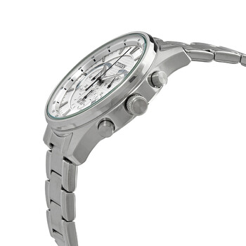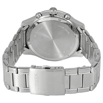 Stainless steel case with a stainless steel bracelet. Fixed stainless steel bezel. Silver dial with luminous silver-tone hands and index hour markers. Minute markers. Tachymeter markings around the outer rim. Dial Type: Analog. Luminescent hands and markers. Chronograph - three sub-dials displaying: 60 second, 60 minute and 24 hour. Quartz movement. Scratch resistant mineral crystal. Solid case back. Round case shape. Case size: 42 mm. Case thickness: 11.7 mm. Band width: 22 mm. Fold over clasp with a push button release. Water resistant at 100 meters / 330 feet. Functions: chronograph, tachymeter, hour, minute, second. Sport watch style. Watch label: Japan Movt. Citizen Chronograph Quartz Silver Dial Men's Watch AN8190-51A.