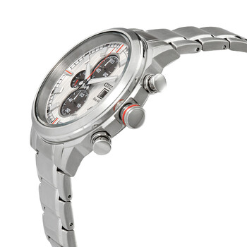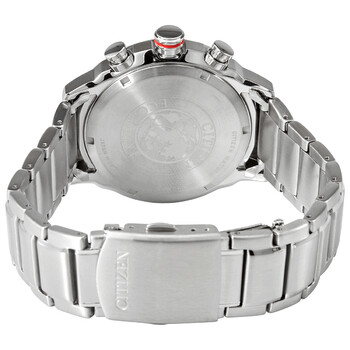 Silver-tone stainless steel case and bracelet. Fixed silver-tone stainless steel bezel. Silver dial with luminous silver-tone hands and index hour markers. Minute markers around the outer rim. Dial Type: Analog. Luminescent hands and markers. Date display at the 3 o'clock position. Chronograph - three sub-dials displaying: 60 minutes, 60 seconds, 24 hours. Citizen Caliber B612 eco-drive movement. Scratch resistant mineral crystal. Solid case back. Round case shape, case size: 43 mm, case thickness: 11.7 mm. Band width: 22 mm. Deployant clasp. Water resistant at 100 meters / 330 feet. Functions: chronograph, date, hour, minute, second. Casual watch style. Watch label: Japan Movt. Citizen Chronograph Silver Dial Men's Watch CA0738-83A.