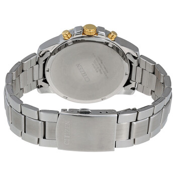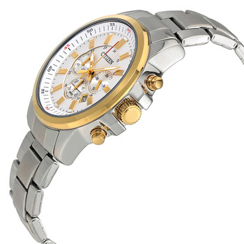 Gold-tone stainless steel case with a two-tone (silver and gold-tone) stainless steel bracelet. Fixed gold-tone bezel. Silver dial with rose gold-tone hands and index hour markers. 24 hour markers. Minute markers around the outer rim. Dial Type: Analog. Luminescent hands and markers. Date display between the 4 and 5 o'clock positions. Chronograph - three sub-dials displaying: 60 second, 60 minute and 24 hours. Quartz movement. Scratch resistant mineral crystal. Pull / push crown. Solid case back. Case size: 45 mm. Case thickness: 12 mm. Round case shape. Deployment clasp. Water resistant at 50 meters / 165 feet. Functions: chronograph, date, hour, minute, second. Casual watch style. Citizen Chronograph White Dial Men's Watch AN8084-59A.