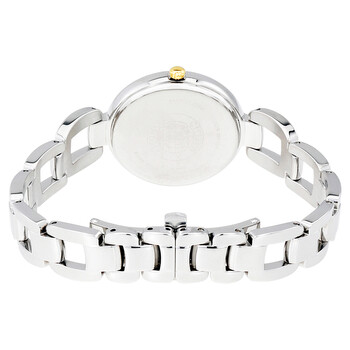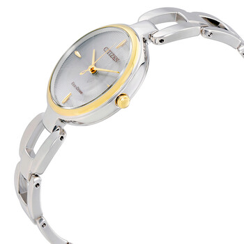 Stainless steel case with a stainless steel bracelet. Fixed gold-tone bezel. Silver dial with gold-tone hands. Index markers at the 3, 6, 9 and 12 o'clock positions. Dial Type: Analog. Citizen caliber Eco-Drive E031 eco-drive movement. Scratch resistant sapphire crystal. Pull / push crown. Solid case back. Round case shape. Case dimensions: 30 mm x 28 mm. Case thickness: 8 mm. Band width: 14 mm. Deployment clasp with a push button release. Water resistant at 50 meters / 165 feet. Functions: hour, minute, second. Casual watch style. Watch label: Japan Movt. Citizen Citizen L Silver Dial Ladies Watch EM0424-53A.