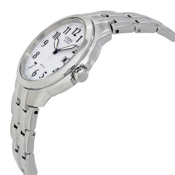 Stainless steel case with a stainless steel bracelet. Fixed stainless steel bezel. White dial with luminous silver-tone hands and Arabic numeral hour markers. Minute markers around the outer rim. Dial Type: Analog. Luminescent hands. Date display at the 3 o'clock position. Eco-drive movement. Scratch resistant mineral crystal. Pull / push crown. Solid case back. Case diameter: 39 mm. Case thickness: 9.5 mm. Round case shape. Band width: 22 mm. Band length: 8.5 inches. Fold over clasp with a push button release. Water resistant at 100 meters / 330 feet. Functions: date, hour, minute, second. Casual watch style. Watch label: Made in Japan. Item Variations: BM7090 51A, BM7090.51A, BM709051A. Citizen Classic Eco Drive Men's Watch BM7090-51A.