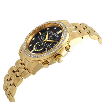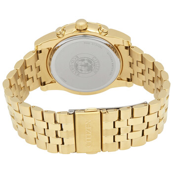 Yellow gold-tone stainless steel case and bracelet. Fixed yellow gold-tone bezel set with Swarovski crystals. Black dial with luminous yellow gold-tone hands and crystal hour markers. Index markers at the 3, 6, 9 and 12 o'clock positions. Minute markers around the outer rim. Dial Type: Analog. Luminescent hands. Date display at the 4 o'clock position. Chronograph - three sub-dials displaying: 60 second, 60 minute and 24 hours. Citizen caliber Eco-Drive H500 eco-drive movement. Scratch resistant mineral crystal. Pull / push crown. Solid case back. Round case shape. Case size: 42 mm. Band width: 22 mm. Fold over clasp. Water resistant at 50 meters / 165 feet. Functions: chronograph, date, hour, minute, second. Sport watch style. Watch label: Japan Movt. Citizen Corso Chronograph Black Dial Yellow Gold-tone Men's Watch AT2452-52E.