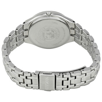 Stainless steel case with a stainless steel bracelet. Fixed stainless steel bezel. Silver dial with silver-tone hands and index hour markers. Minute markers around the outer rim. Dial Type: Analog. Date display at the 3 o'clock position. Citizen caliber Eco-Drive E011 eco-drive movement. Scratch resistant mineral crystal. Pull / push crown. Solid case back. Round case shape. Case size: 32 mm. Case thickness: 7 mm. Band width: 16 mm. Band length: 7 inches. Fold over clasp with a push button release. Water resistant at 30 meters / 100 feet. Functions: date, hour, minute, second. Casual watch style. Watch label: Japan Movt. Citizen Corso Eco-Drive Silver Dial Stainless Steel Ladies Watch EW2490-55A.