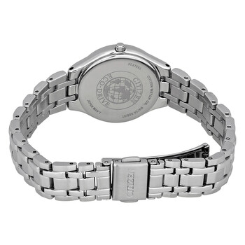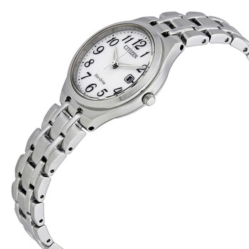 Stainless steel case with a stainless steel bracelet. Fixed stainless steel bezel. White dial with silver-tone skeleton hands and Arabic numeral hour markers. Dial Type: Analog. Date display at the 3 o'clock position. Citizen caliber Eco-Drive E011 quartz movement. Scratch resistant mineral crystal. Pull / push crown. Solid case back. Round case shape. Case size: 28 mm. Case thickness: 7 mm. Band width: 14 mm. Band length: 7 inches. Fold over clasp with a push button release. Water resistant at 30 meters / 100 feet. Functions: date, hour, minute, second. Casual watch style. Citizen Corso Eco-Drive White Dial Stainless Steel Ladies Watch EW2480-59A.