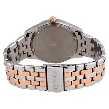 Stainless steel case with a two-tone (silver-tone and rose gold-tone) stainless steel bracelet. Fixed rose gold-tone bezel. Light champagne mother of pearl dial with rose gold-tone hands and index hour markers. Dial Type: Analog. Luminescent hands and markers. Date display at the 3 o'clock position. Small seconds sub-dial. Citizen caliber B690 eco-drive movement. Scratch resistant mineral crystal. Solid case back. Round case shape. Case size: 36 mm. Case thickness: 8 mm. Brcaelet width: 20 mm. Fold over clasp with a push button release. Water resistant at 100 meters / 330 feet. Functions: date, hour, minute, second. Casual watch style. Citizen Corso Light Champagne Mother of Pearl Dial Two-Tone Ladies Watch EV1036-51Y.