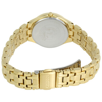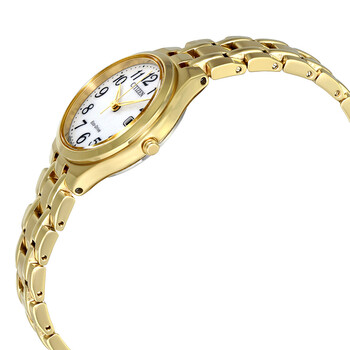 Yellow gold-tone stainless steel case and bracelet. Fixed yeloow gold-tone bezel. White dial with yellow gold-tone hands and Arabic numeral hour markers. Minute markers around the outer rim. Dial Type: Analog. Date display at the 3 o'clock position. Citizen caliber Eco-Drive E011 quartz movement. Scratch resistant mineral crystal. Pull / push crown. Solid case back. Round case shape. Case size: 28 mm. Case thickness: 7 mm. Band width: 14 mm. Band length: 7 inches. Fold over clasp with a safety release. Water resistant at 30 meters / 100 feet. Functions: date, hour, minute, second. Casual watch style. Citizen Corso White Dial Yellow Gold-tone Ladies Watch EW2482-53A.