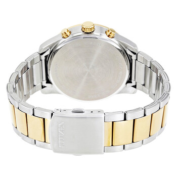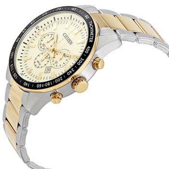 Stainless steel case with a two-tone stainless steel bracelet. Cream dial with gold-tone hands and index hour markers. Tachymeter. Dial Type: Analog. Luminescent hands and markers. Date display between 4 and 5 o'clock position. Chronograph - three sub-dials displaying: 60 second, 60 minute and 24 hours. Quartz movement. Scratch resistant mineral crystal. Pull / push crown. Solid case back. Case size: 44 mm. Round case shape. Band width: 22 mm. Deployment with push button release clasp. Water resistant at 50 meters / 165 feet. Functions: chronograph, date, hour, minute, second. Casual watch style. Citizen Cream Dial Men's Two Tone Chronograph Watch AN8076-57P.