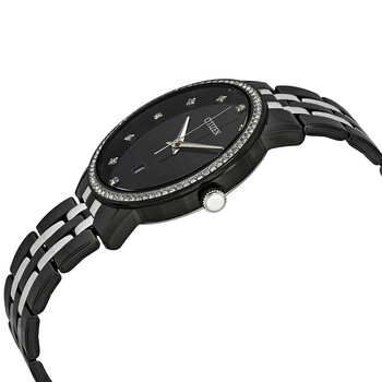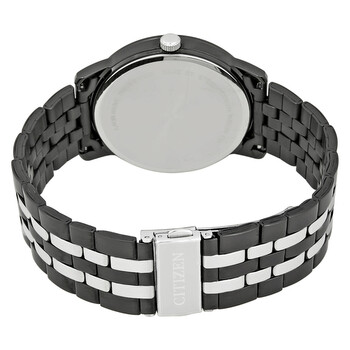 Black ion-plated stainless steel case with a two-tone (black ion-plated and silver-tone) stainless steel bracelet. Fixed black ion-plated bezel set with crystals. Black dial with silver-tone hands and crystal hour markers. Dial Type: Analog. Date display at the 6 o'clock position. Citizen caliber G111 quartz movement. Scratch resistant mineral crystal. Pull / push crown. Solid case back. Round case shape. Case size: 40 mm. Case thickness: 8 mm. Band width: 22 mm. Fold over clasp. Water resistant at 50 meters / 165 feet. Functions: date, hour, minute, second. Dress watch style. Watch label: Japan Movt. Citizen Crystal Black Dial Men's Watch BI5037-52E.