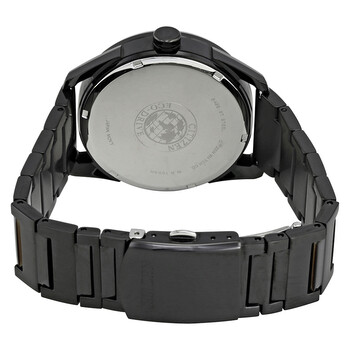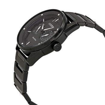 Black stainless steel case with a black stainless steel bracelet. Black black stainless steel bezel. Black dial with black hands and index hour markers. Dial Type: Analog. Luminescent hands and markers. Date display at the 3 o'clock position. Two sub-dials displaying: date, and day of the week. Eco-Drive 8725 quartz movement. Scratch resistant mineral crystal. Push / pull crown. Solid case back. Case size: 42 mm. Case thickness: 12 mm. Round case shape. Bracelet width: 22 mm. Fold over clasp with a safety release. Water resistant at 100 meters / 330 feet. Functions: date, day, hour, minute, second. Casual watch style. Citizen CTO Black Dial Men's Watch BU4025-59E.