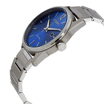 Stainless steel case with a stainless steel bracelet. Fixed stainless steel bezel. Blue dial with silver-tone hands and index hour markers. An Arabic numeral apperas at the 12 o'clock position. Dial Type: Analog. Date display at the 3 o'clock position. Citizen caliber Eco-Drive E111 eco-drive movement. Scratch resistant mineral crystal. Pull / push crown. Solid case back. Round case shape. Case size: 42 mm. Case thickness: 9 mm. Band width: 22 mm. Fold over clasp. Water resistant at 100 meters / 330 feet. Functions: date, hour, minute, second, solar-powered. Casual watch style. Watch label: Japan Movt. Citizen CTO - Check This Out Blue Dial Men's Watch BM7410-51L.