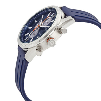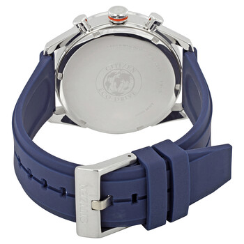 Stainless steel case with a blue polyurethane strap. Fixed stainless steel bezel. Blue dial with luminous silver-tone hands and index hour markers. Minute markers around the outer rim. Dial Type: Analog. Luminescent hands and markers. Date display at the 3 o'clock position. Chronograph - three sub-dials displaying: 60 second, 30 minute and 24 hours. Citizen caliber Eco-Drive B612 quartz movement. Scratch resistant mineral crystal. Pull / push crown. Solid case back. Round case shape. Case size: 43 mm. Case thickness: 11 mm. Band width: 22 mm. Band length: 8 inches. Tang clasp. Water resistant at 100 meters / 330 feet. Functions: chronograph, date, hour, minute, second. Sport watch style. Watch label: Japan Movt. Citizen CTO Chronograph Blue Dial Men's Watch CA0661-01L.