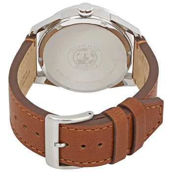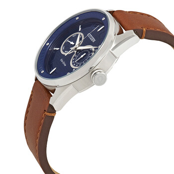 Stainless steel case with a caramel brown leather strap. Fixed stainless steel bezel. Navy blue dial with luminous silver-tone hands and index hour markers. Dial Type: Analog. Luminescent hands and markers. Date display at the 3 o'clock position. Two sub-dials displaying: date and day of the week. Citizen caliber Eco-Drive 8725 eco-drive movement. Scratch resistant mineral crystal. Pull / push crown. Solid case back. Round case shape. Case size: 42 mm. Case thickness: 12 mm. Band width: 22 mm. Tang clasp. Water resistant at 100 meters / 330 feet. Functions: date, day, hour, minute, second. Cto Series. Sport watch style. Watch label: Japan Movt. Citizen CTO Eco-Drive Navy Blue Dial Men's Watch BU4020-01L.