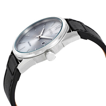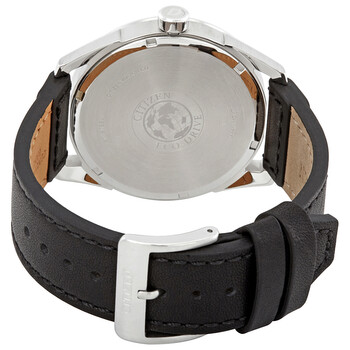 Silver-tone stainless steel case with a black leather strap. Fixed silver-tone stainless steel bezel. Silver-tone dial with silver-tone hands and index with Arabic numeral at 12 o'clock hour markers. Dial Type: Analog. Date display at the 3 o'clock position. Eco-drive movement. Scratch resistant mineral crystal. Solid case back. Round case shape. Case size: 42 mm. Buckle clasp. Water resistant at 100 meters / 330 feet. Functions: date, hour, minute, second. Casual watch style. Citizen CTO Silver Dial Men's Leather Watch BM7410-01A.