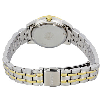 Stainless steel case with a two-tone (silver and yellow gold-tone) stainless steel bracelet. Fixed yellow gold-tone bezel. Black dial with yellow gold-tone hands and diamond hour markers. Dial Type: Analog. Date display at the 3 o'clock position. Citizen caliber Eco-Drive E011 eco-drive movement. Scratch resistant mineral crystal. Pull / push crown. Solid case back. Case size: 28 mm. Case thickness: 9 mm. Round case shape. Band width: 14 mm. Fold over clasp with a safety release. Water resistant at 100 meters / 330 feet. Functions: date, hour, minute, second. Casual watch style. Watch label: Japan Movt. Citizen Diamond Black Dial Ladies Watch EW2394-59E.