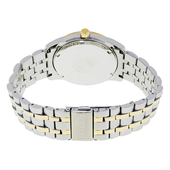 Stainless steel case with a two-tone (silver and yellow gold-tone) stainless steel bracelet. Fixed yellow gold-tone bezel. Black dial with yellow gold-tone hands and diamond hour markers. Dial Type: Analog. Date display at the 3 o'clock position. Citizen caliber Eco-Drive E111 eco-drive movement. Scratch resistant mineral crystal. Pull / push crown. Solid case back. Case size: 39 mm. Case thickness: 10 mm. Round case shape. Band width: 21 mm. Fold over clasp with a safety release. Water resistant at 100 meters / 330 feet. Functions: date, hour, minute, second. Dress watch style. Watch label: Japan Movt. Citizen Diamond Black Dial Men's Watch BM7344-54E.