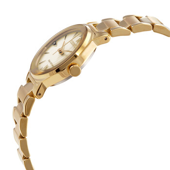 Gold-tone stainless steel case and bracelet. Fixed gold-tone bezel. Champagne dial with gold-tone hands and index hour markers. Diamond-tipped index markers at the 3, 6, 9 and 12 o'clock positions. Dial Type: Analog. Citizen caliber E031 eco-drive movement. Scratch resistant mineral crystal. Pull / push crown. Solid case back. Round case shape. Case size: 28.2 mm. Case thickness: 7.8 mm. Fold over clasp with a safety release. Water resistant at 30 meters / 100 feet. Functions: hour, minute, second. Axiom Diamond Series. Dress watch style. Watch label: Japan Movt. Citizen Diamond Eco-Drive Champagne Dial Ladies Watch EM0732-51P.