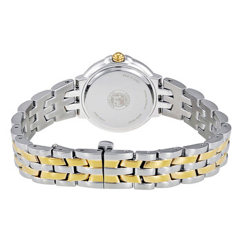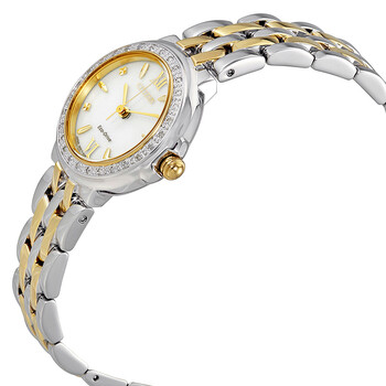 Stainless steel case with a two-tone stainless steel bracelet. Fixed two-tone bezel set with crystals. White dial with gold-tone hands and index hour markers. Roman numerals mark the 6 and 12 o'clock positions. Dial Type: Analog. Eco-Drive E031 quartz movement. Scratch resistant mineral crystal. Pull / push crown. Solid case back. Case size: 28 mm. Case thickness: 10 mm. Round case shape. Band width: 16 mm. Deployment clasp with a push button release. Water resistant at 30 meters / 100 feet. Functions: hour, minute, second. Additional Info: in general, withstands splashes or brief immersion in water, but not suitable for swimming or bathing. Casual watch style. Watch label: Japan Movt. Citizen Diamond Ladies Watch EM0444-56A.