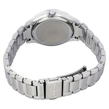 Stainless steel case with a stainless steel bracelet. Fixed stainless steel bezel. Lavender floral motif dial with luminous silver-tone hands and dot hour markers. Arabic numerals mark the 6 and 12 o'clock positions. Dial Type: Analog. Luminescent hands. Citizen caliber Eco-Drive E031 quartz movement. Scratch resistant mineral crystal. Pull / push crown. Solid case back. Case size: 30 mm. Case thickness: 8 mm. Round case shape. Band width: 14 mm. Fold over clasp with a safety release. Water resistant at 30 meters / 100 feet. Functions: hour, minute, second. Dress watch style. Citizen Diamond Ladies Watch EM0450-53X.
