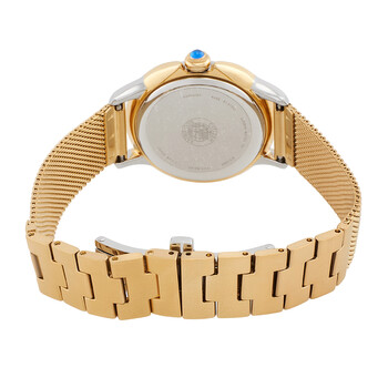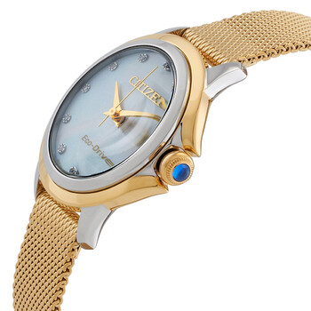 Yellow gold-tone stainless steel case with a yellow gold-tone stainless steel mesh bracelet. Fixed yellow gold-tone stainless steel bezel. Mother of pearl dial with yellow gold-tone hands and diamond hour markers. Dial Type: Analog. Citizen Caliber E031 eco-drive movement. Scratch resistant sapphire crystal. Solid case back. Round case shape, case size: 32 mm. Deployment clasp. Water resistant at 50 meters / 165 feet. Functions: hour, minute, second. Dress watch style. Citizen Diamond Ladies Watch EM0794-54D.